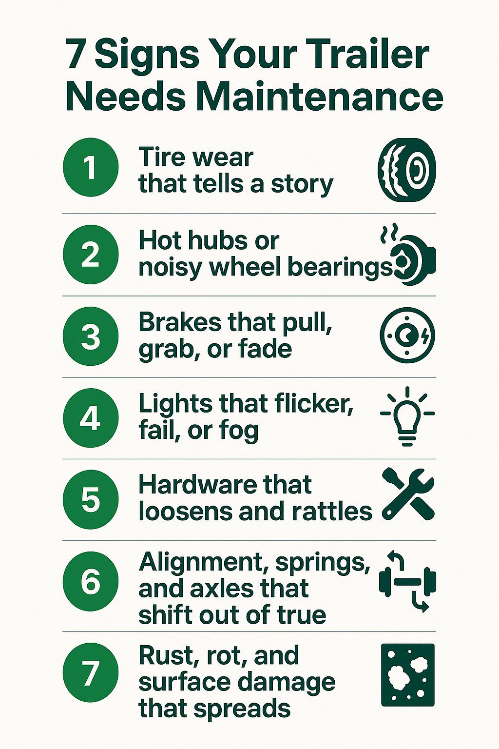 Your trailer tires speak first. Uneven tread, feathering, and cupping tell you where to look.