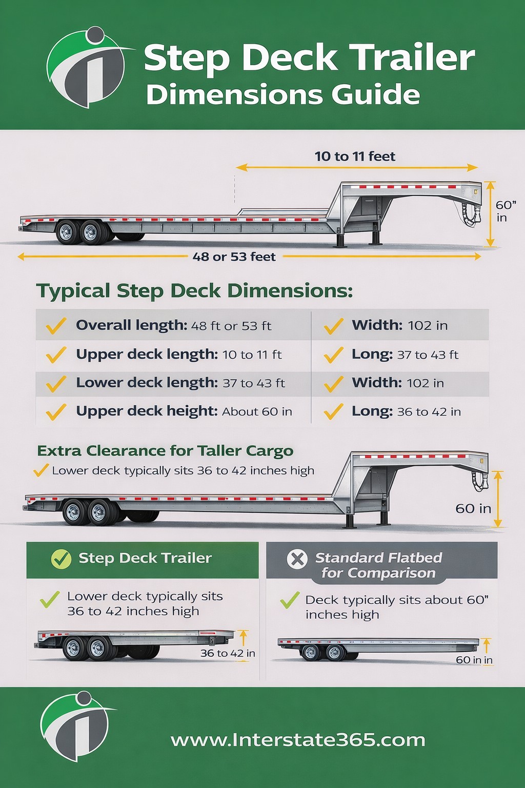 These are planning numbers, not a substitute for measuring your exact trailer. Specs vary by brand, suspension, tire size, and configuration. For example, some step deck models listed by INTERSTATE 365 show a 53-foot length, a 102-inch width, a 60-inch upper-deck height, and a 42-inch lower-deck height. You can see an example on this Reitnouer step deck trailer page.